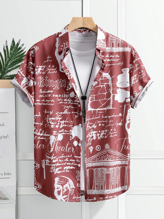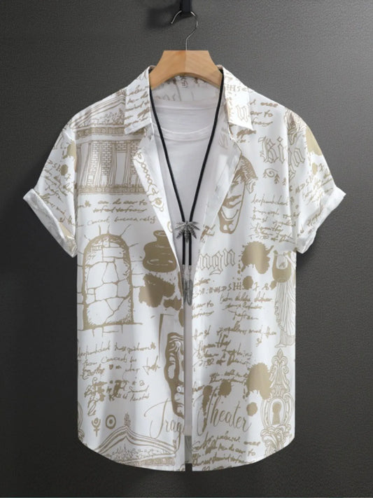 Men's Vintage Art Print Short Sleeve Button-Up Shirt