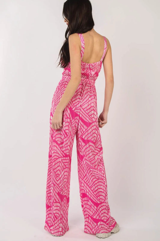 VERY J Printed Pleated Sleeveless Wide Leg Jumpsuit