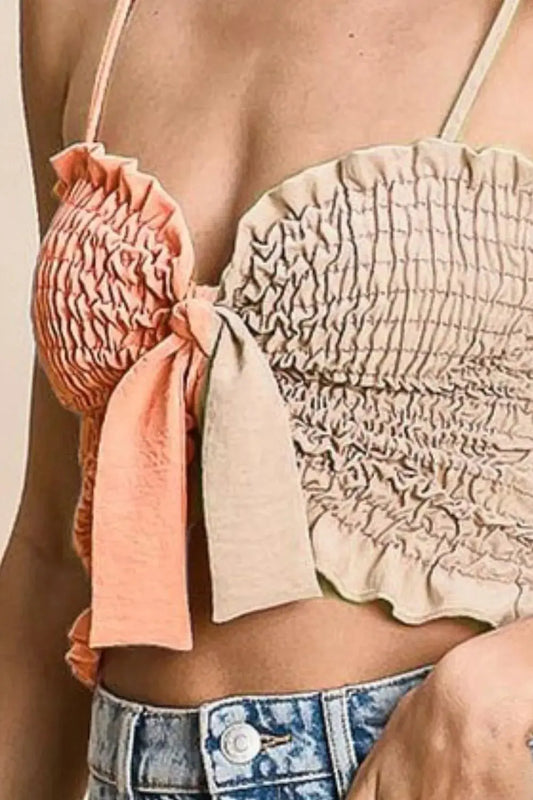 BiBi Woven Color Block Smocked with Ribbon Bra Top