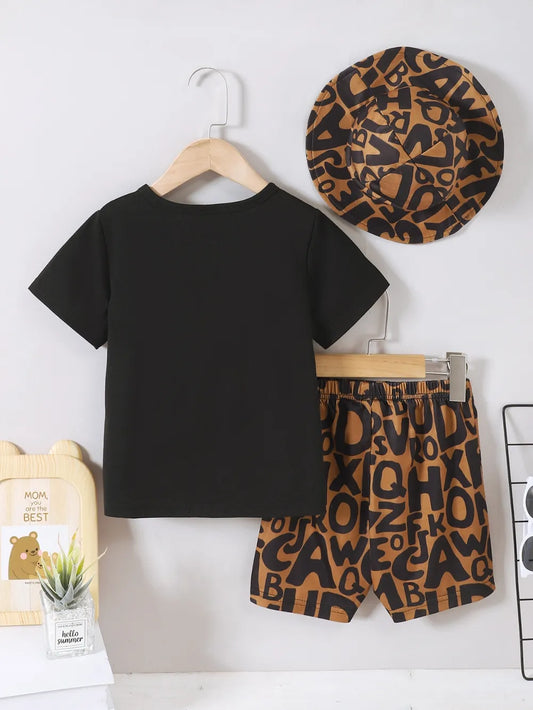 Children's Hat Dinosaur Plaid Button Up Top and Shorts 3-Piece Set