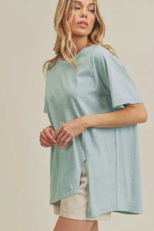 Aemi + Co Asymmetrical Front Slit Round Neck Raglan Sleeve T-Shirt