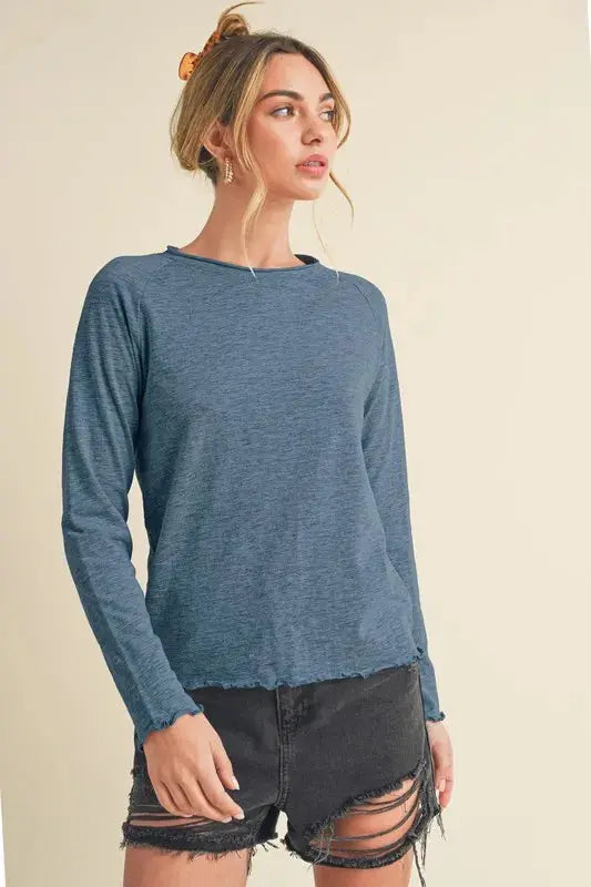 Aemi + Co Lettuce Hem Scoop Neck Long Sleeve Knit Top