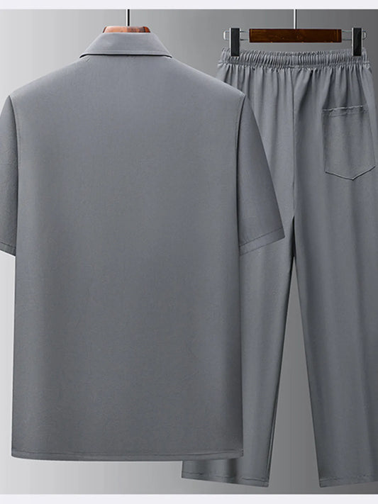 Men's Full Size Button Up Short Sleeve Top and Pants Set Plus Size