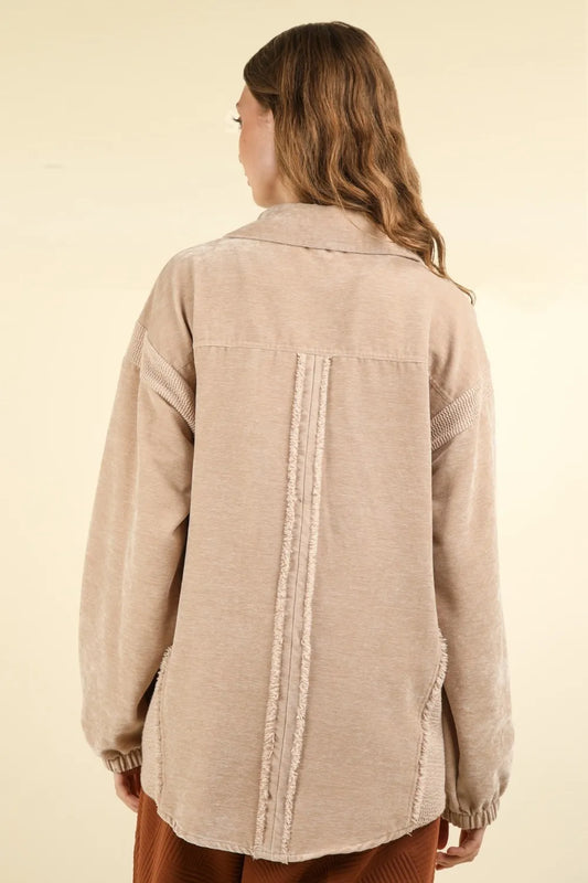 VERY J Mixed Media Button Down Raw Hem Shacket