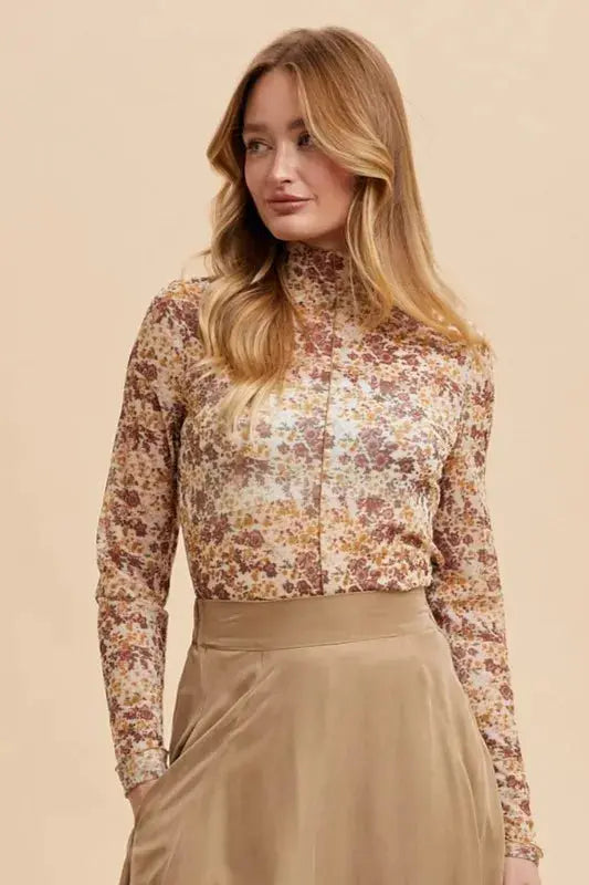 Annie Wear Floral Lettuce Hem Sheer Mesh Top