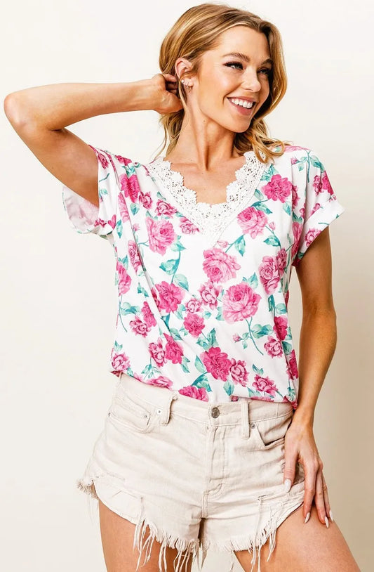BiBi Rose Printed Poly Span with Crochet Lace Top