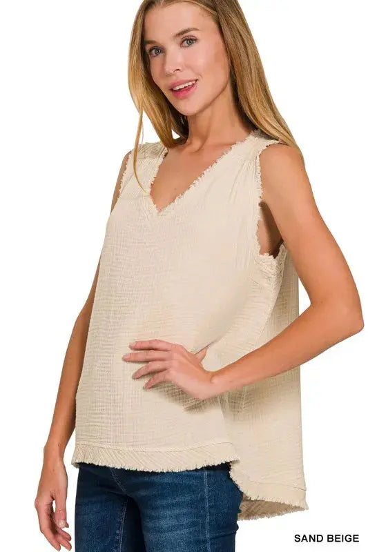 Zenana Double Gauze Raw Edge V-Neck Tank
